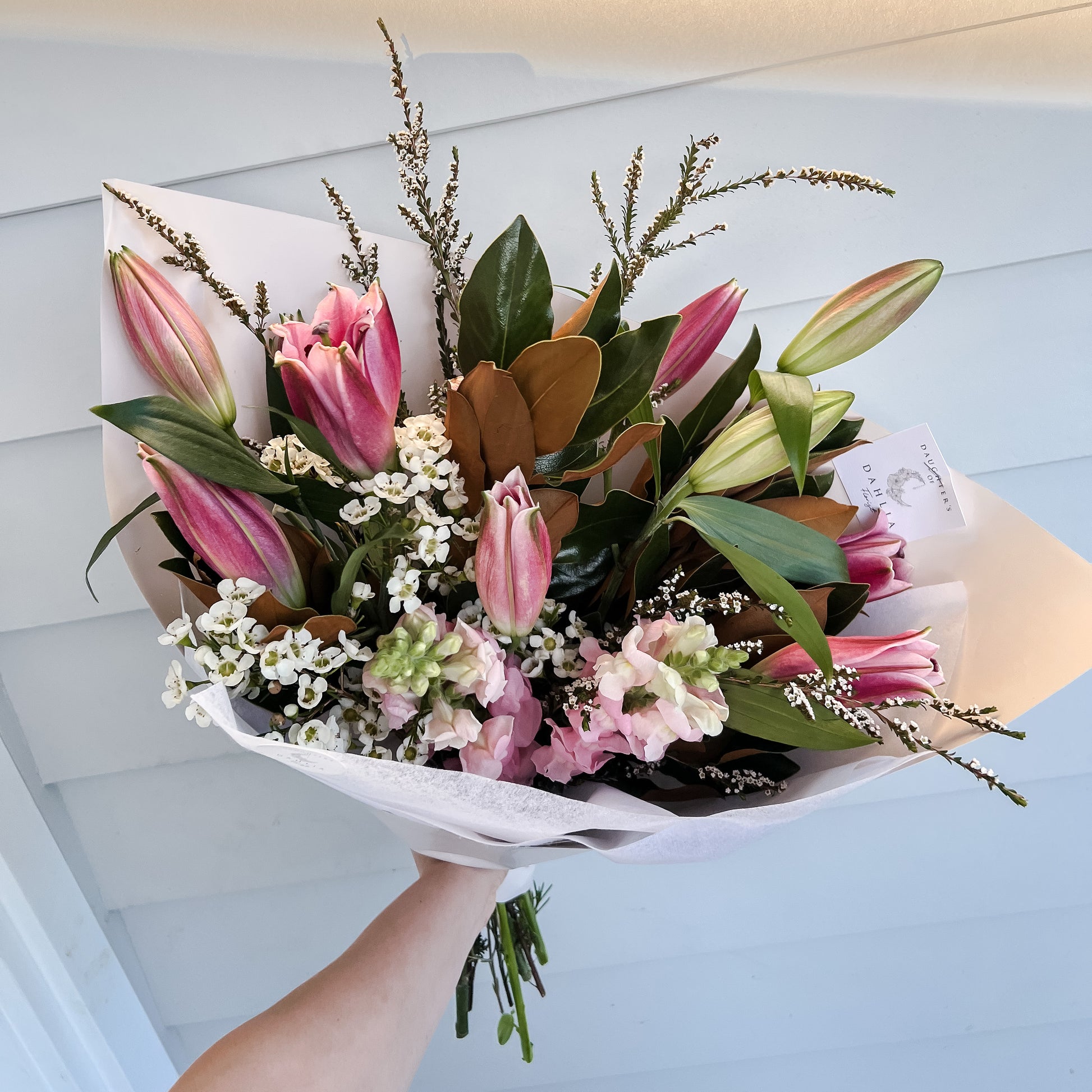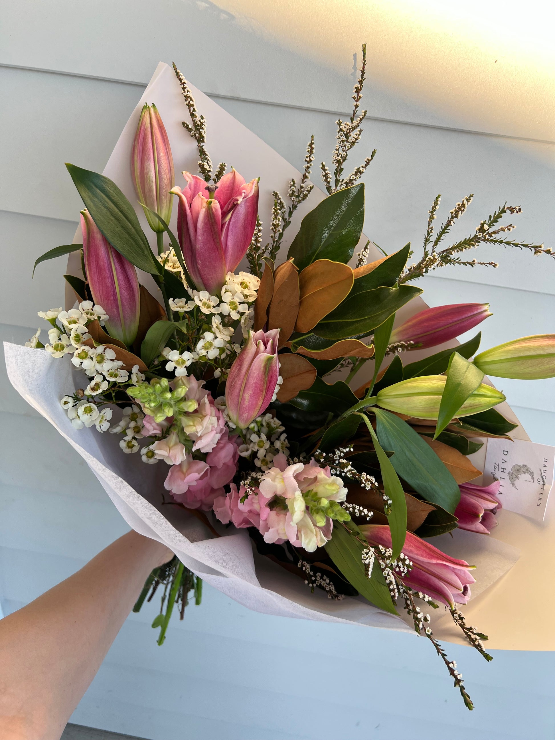 Deep pink Oriental Lillys in a mix of greenery and Filler
